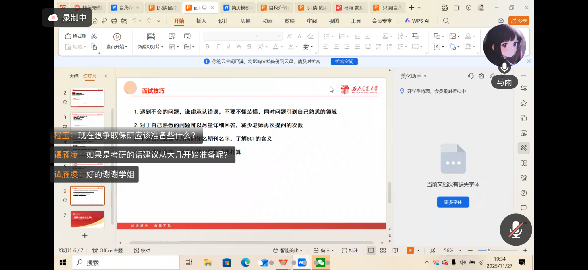 在自由提问环节,同学们围绕考研备考节奏、保研材料优化、面试常见问题等内容踊跃提问。马雨、王贤慧和邓锦文结合自身经验逐一细致解答,并延伸分享实用建议,线上互动氛围热烈。