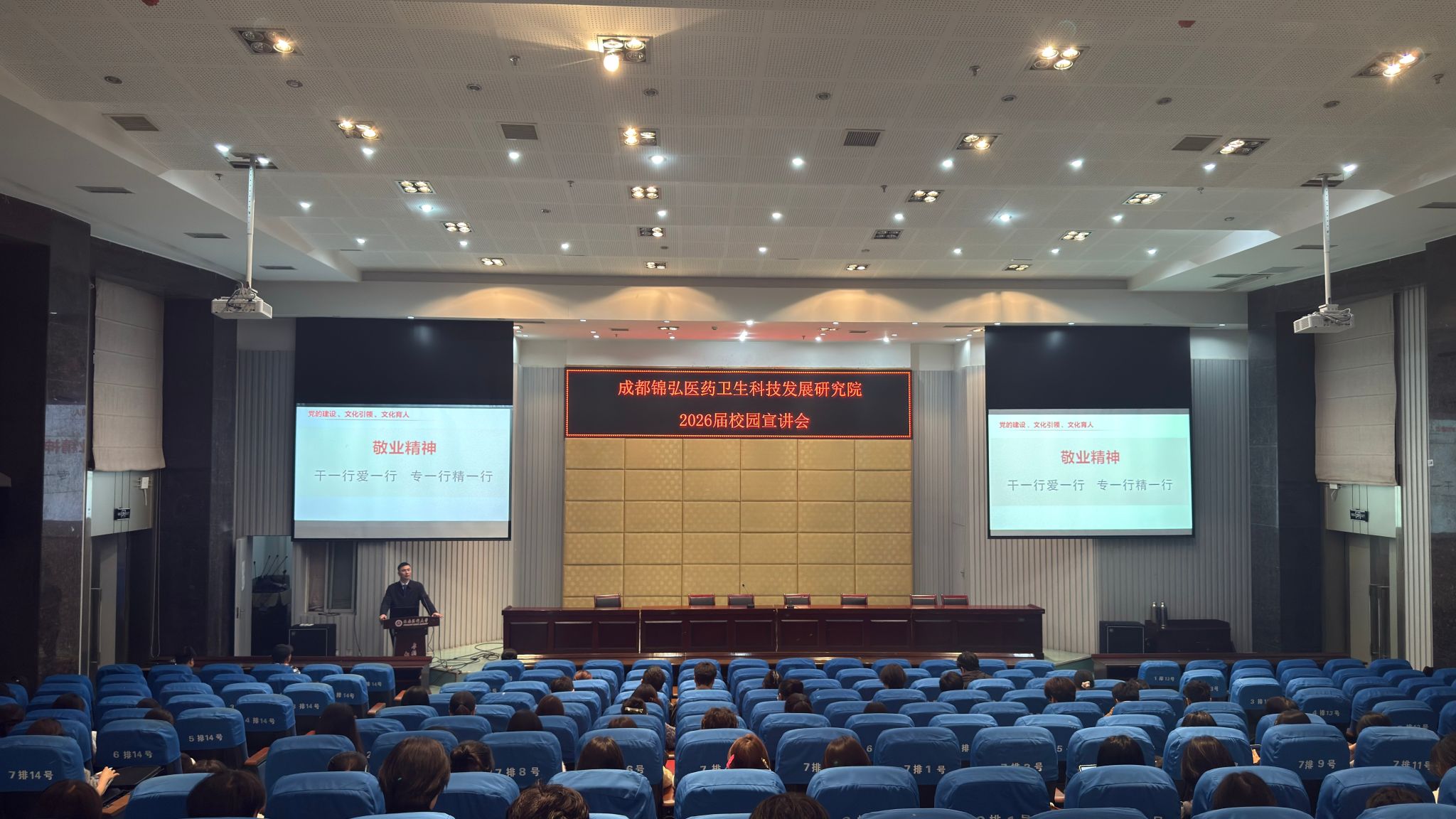 为拓展优质就业渠道,助力毕业生实现更充分、更高质量的就业目标,10月27日晚,人文与管理学院邀请成都锦弘医药卫生科技发展研究院于城北校区第二学术报告厅举办校园招聘宣讲会。本次宣讲会由成都锦弘医药卫生科技发展研究院理事长曾友元主讲,学院党委副书记马俊主持会议,学院2026届毕业生100余人积极参会。