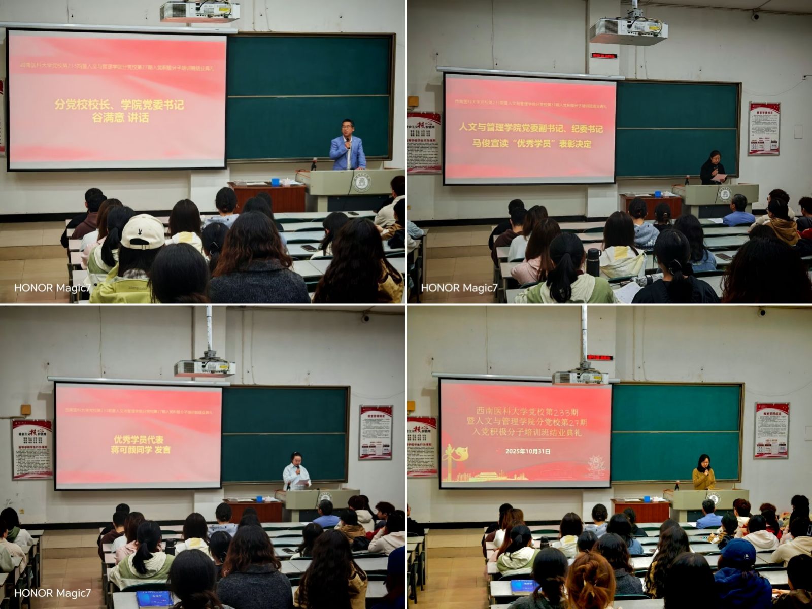 10月31日晚,西南医科大学第233期暨人文与管理学院分党校第27期入党积极分子培训班结业典礼于城北校区荟文楼隆重举行。人文与管理学院党委书记、分党校校长谷满意,学院党委副书记、纪委书记马俊,人文与管理学院分党校校务委员及第233期全体学员参加了结业典礼。