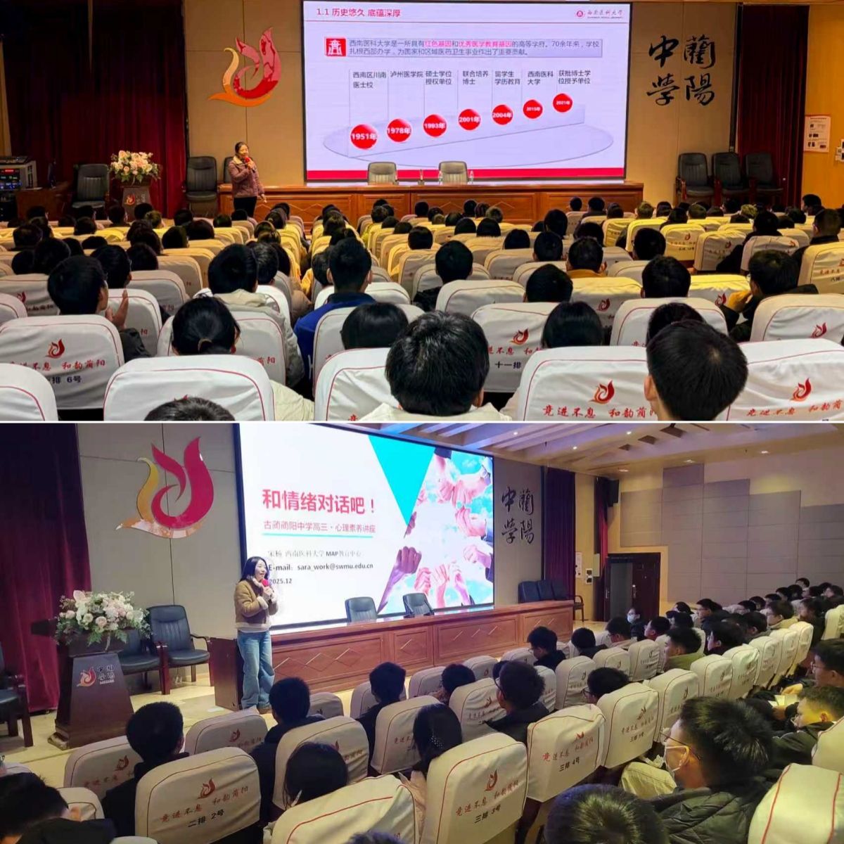 12月22日,人文与管理学院党委副书记马俊、应用心理教研室教师宋杨赴古蔺蔺阳中学,为300余名高三学子送上“2026年本科招生宣讲与心理调适专题讲座”双重大礼。