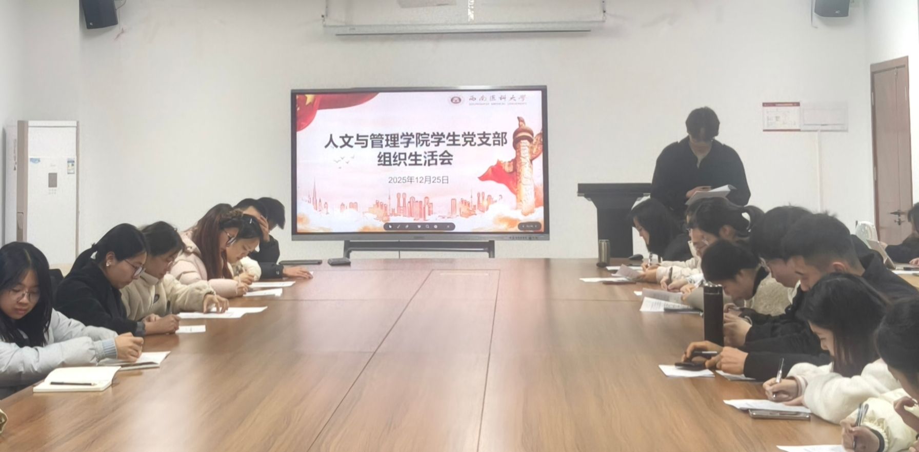 12月25日,人文与管理学院党支部在文渊楼233会议室开展年度组织生活会,并依照《西南医科大学党支部书记考核民主测评量化评分表》相关要求,对党支部书记范丹丹同志履职情况进行了严肃认真的民主测评。支部11名正式党员参与此次评分。