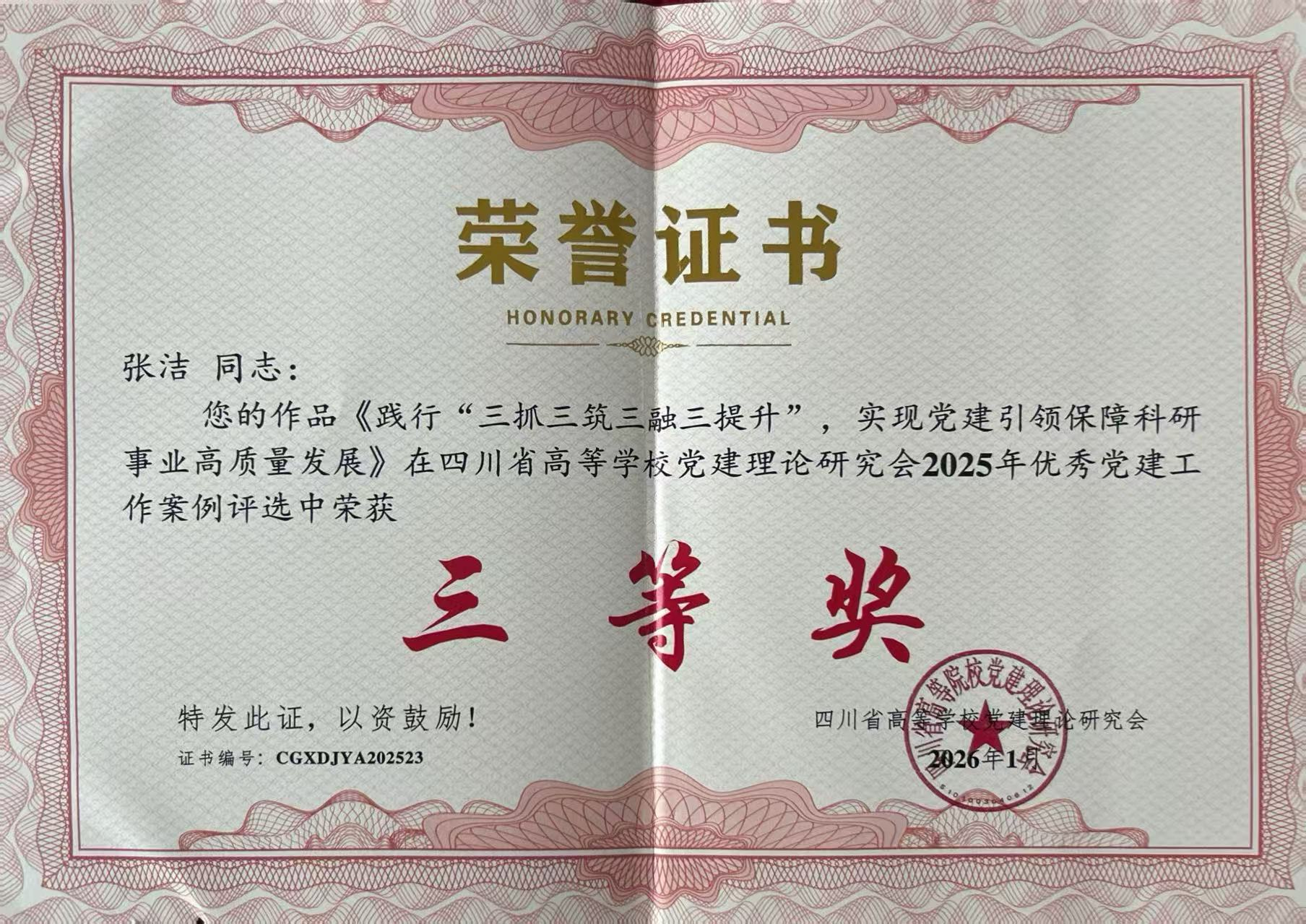 近日,四川省高等学校党建理论研究会公布了2025年优秀党建工作案例评选结果。人文与管理学院职工第二党支部党建案例《践行“三抓三筑三融三提升”,实现党建引领保障科研事业高质量发展》荣获三等奖。