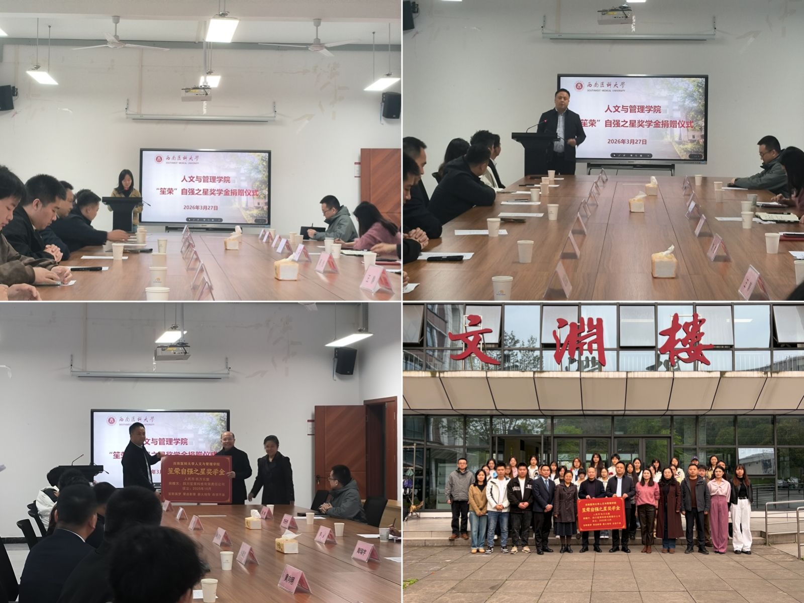 3月27日上午,人文与管理学院“笙荣”自强之星奖学金捐赠仪式在文渊楼233会议室圆满举行。四川笙荣科技有限责任公司总经理、2005级应用心理学专业校友徐翼虎,副总经理杨晏青,副总经理兼人力资源部总监黄向明,销售部经理郭茂,工程部经理邱淳,西南医科大学教育发展基金会副理事长陶瑞宇,人文与管理学院党委副书记、纪委书记马俊,学院副院长周佳、李彦,学院学生科全体辅导员和20名获奖学生代表等出席仪式。仪式由学生科科长范丹丹主持。